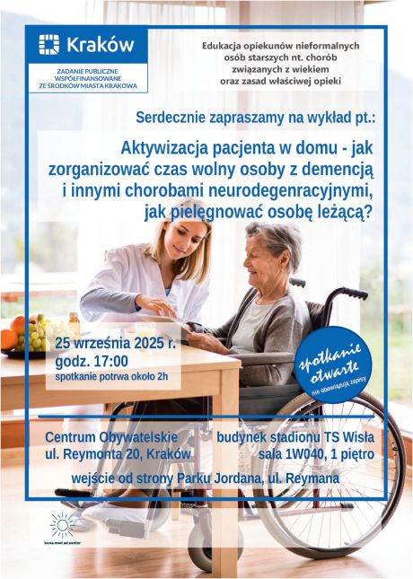 Fundacja BONA-MED ad SENIOR serdecznie zaprasza wszystkie osoby opiekujące się osobami starszymi w domu oraz seniorów na wykład i warsztaty pt.: „Aktywizacja pacjenta w domu - jak zorganizować czas wolny osoby z demencją i innymi chorobami neurodegeneracyjnymi, jak pielęgnować osobę leżącą”.