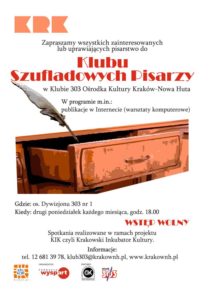 Klub 303 Orodka Kultury Krakw-Nowa Huta (os. Dywizjonu 303 nr 1) zaprasza 14 kwietnia o godz. 18.00 na kolejne spotkanie dla osb zainteresowanych lub uprawiajcych pisarstwo. Klub zakada wsplne czytanie utworw, doskonalenie si w sztukach edycyjnych przy uyciu komputerw, wczanie si w rodowisko twrcw publikujcych w Internecie. Spotkania odbywaj si w drugi poniedziaek kadego miesica.