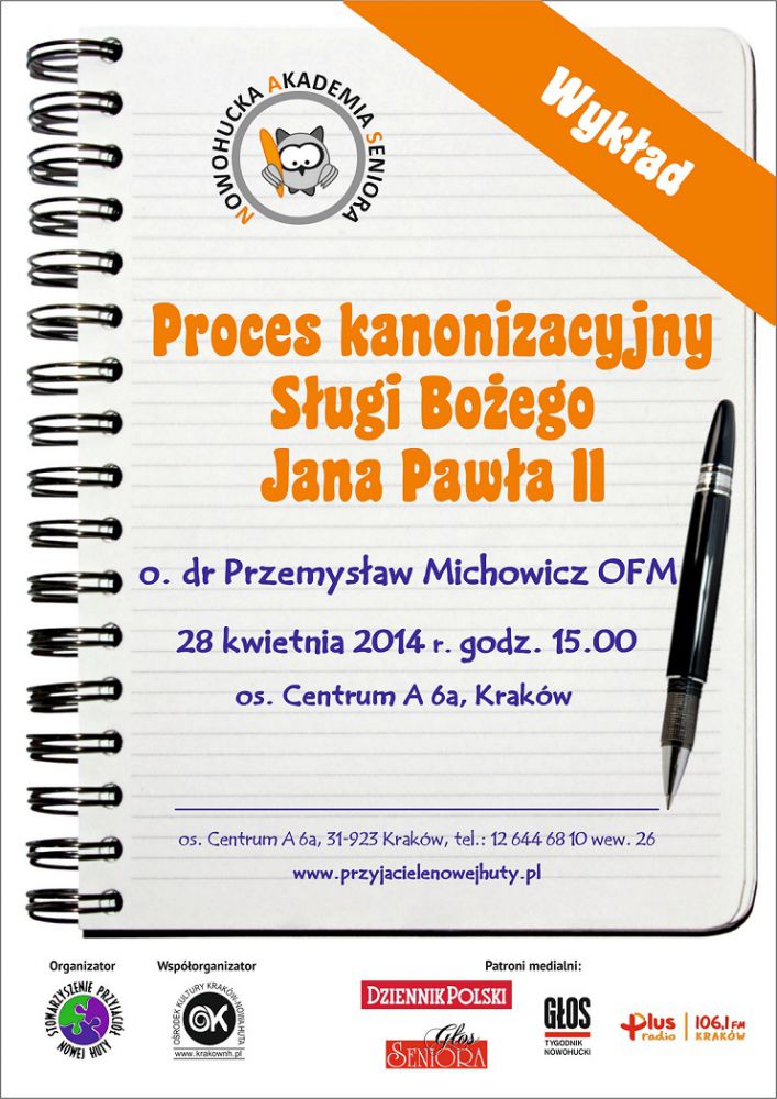 28 kwietnia o godz. 15.00 (os. Centrum A 6a) odbędzie się prelekcja w ramach Nowohuckiej Akademii Seniora, której tematem będzie proces kanonizacji na przykładzie przypadku Jana Pawła II.
