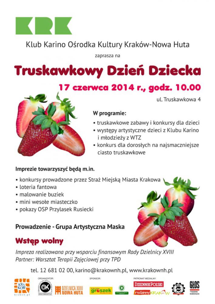 Klub Karino Orodka Kultury Kraków-Nowa Huta (ul. Truskawkowa 4) organizuje 17 czerwca 2014 r. w godz. 10.00-14.00 najpyszniejsze krakowskie obchody Dnia Dziecka.