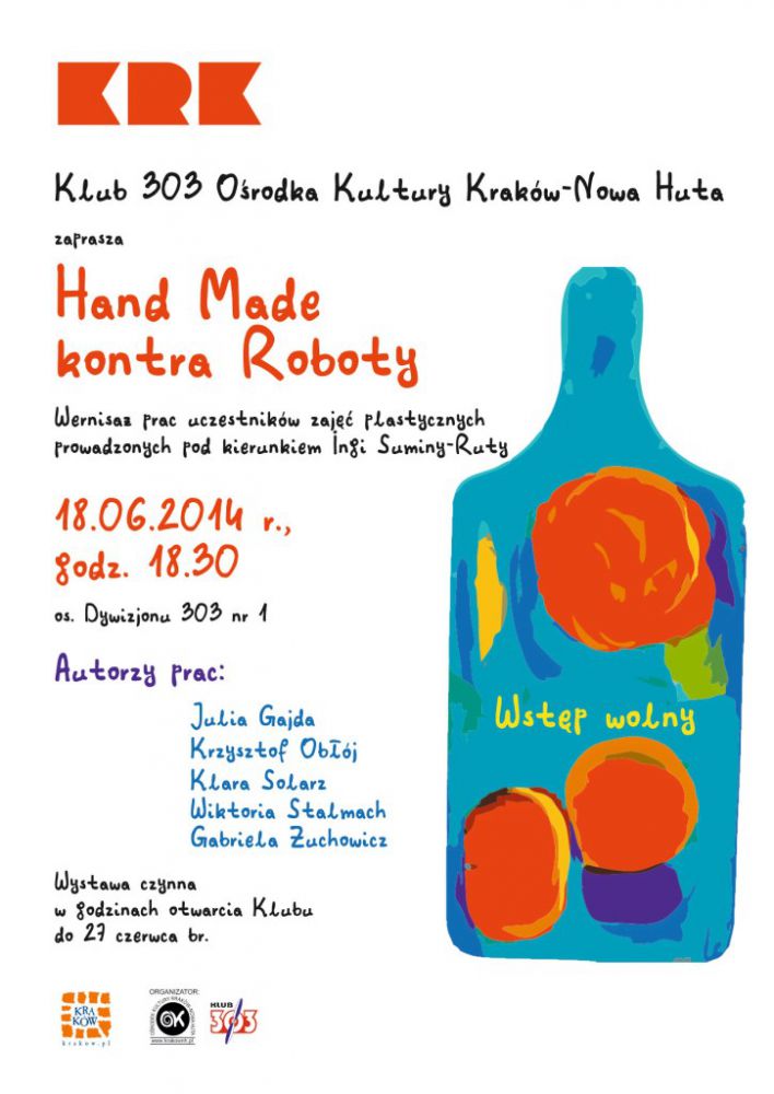 Klub 303 Oœrodka Kultury Kraków-Nowa Huta (os. Dywizjonu 303 nr 1) zaprasza na wernisaż prac plastycznych uczestników zajęć klubowych pod kierunkiem Ingi Suminy-Ruty, który odbędzie się 18 czerwca 2014 r. o godz. 18.30.