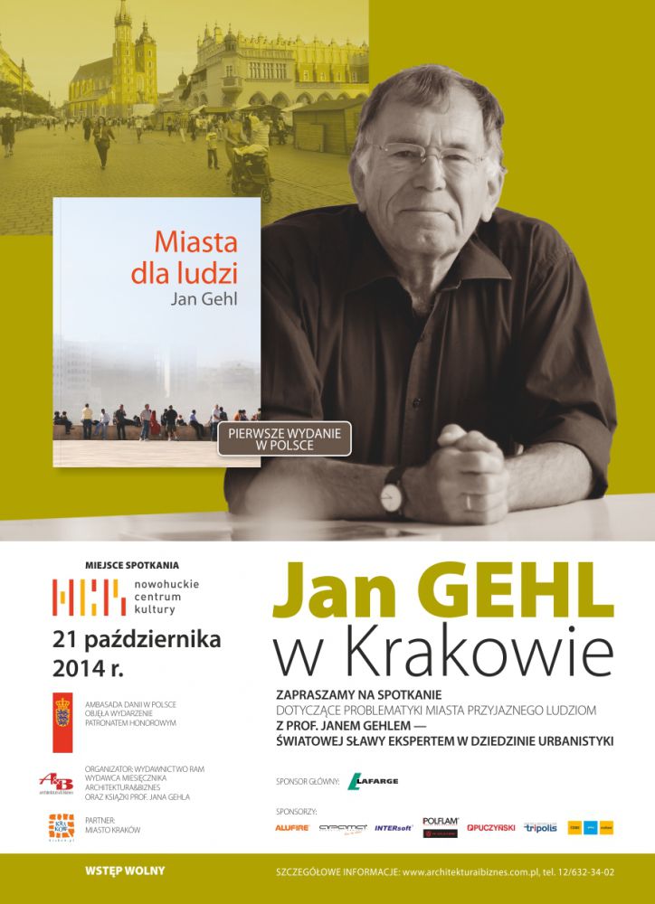 Zapraszamy serdecznie 21 padziernika 2014 r. w NCK Kraków, godz. 18.30 na spotkanie z Profesorem Janem Gehlem, wybitnym duńskim architektem i urbanistš, propagatorem koncepcji humanistycznego rozwoju miast i autorem projektów zmian w przestrzeni miejskiej m.in. Nowego Jorku i Moskwy.