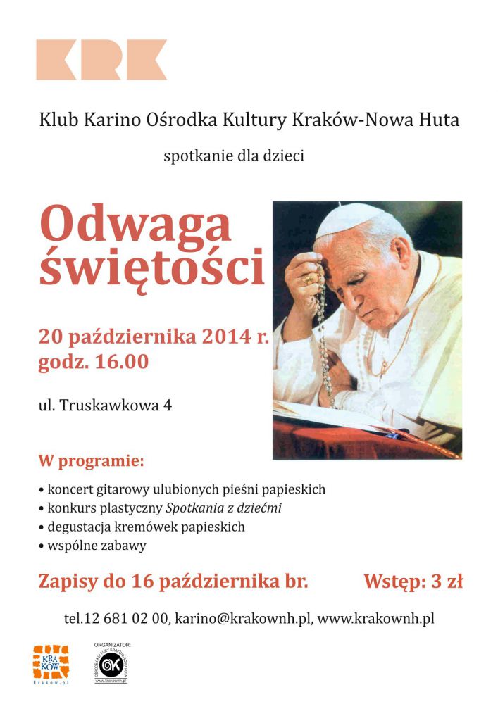 Klub Karino Oœrodka Kultury Kraków-Nowa Huta (ul. Truskawkowa 4) zaprasza na spotkanie dla dzieci z okazji obchodów Dnia Papieskiego.