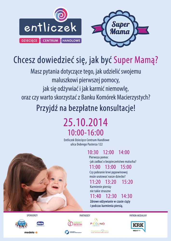 Dieta w cišży i po porodzie, przechowywanie krwi pępowinowej, karmienie piersiš czy pierwsza pomoc niemowlakom to główne tematy pierwszej akcji Super Mama. Podczas spotkania z rodzicami, oprócz fachowej wiedzy i porad, będzie można porozmawiać z kwalifikowanš położnš czy też otrzymać wsparcie od doradcy laktacyjnego.
