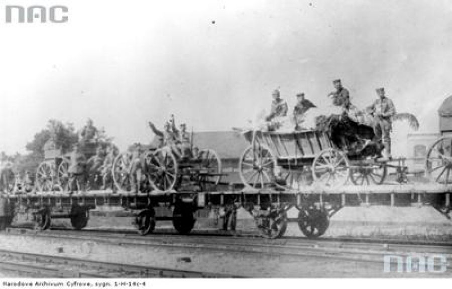 Podpis do zdjęcia: Wojska niemieckie zdšżajšce do granicy podczas I Wojny wiatowej. Żołnierze przewożeni na platformach kolejowych. 1914, wł. Narodowego Archiwum Cyfrowego.