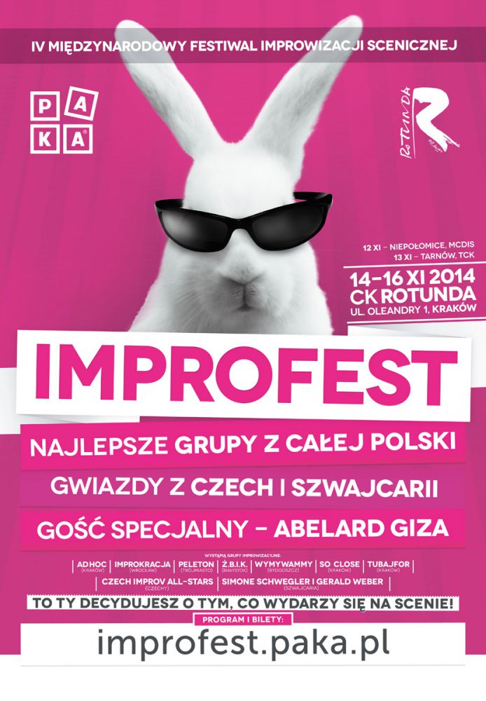 Czwartš edycję festiwalu ImproFest (12-16.11.2014) uœwietni znakomity duet szwajcarskich improwizatorów Simone Schwegler i Gerald Weber, najlepsi improwizatorzy z Czech – „Czech Impro All Stars”, a także najlepsze polskie grupy specjalizujšce się w improwizacji – AD HOC (Kraków), Peleton (Gdańsk), wymyWammy (Bydgoszcz), ŻBIK (Białystok), Improkracja (Wrocław), So Close (Kraków) oraz Tubajfor (Kraków). Na festiwalu pojawiš się znakomici goœcie specjalni – Abelard Giza i Wojciech Tremiszewski znani z kabaretu Limo i serialu improwizowanego „Spadkobiercy”.