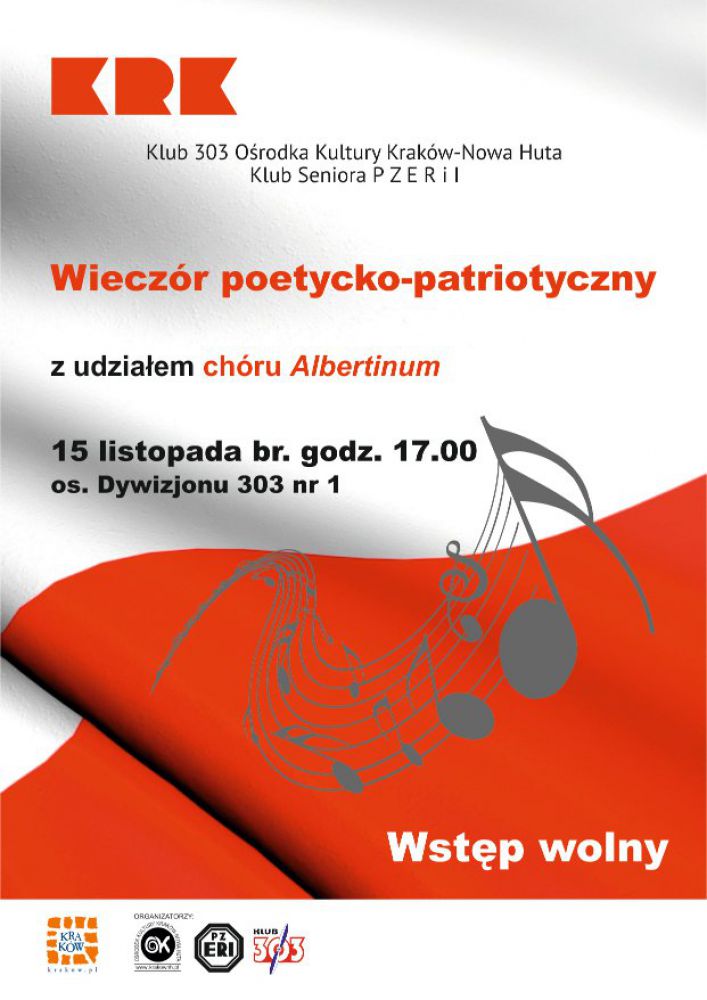 Klub 303 Orodka Kultury Kraków-Nowa Huta zaprasza na spotkanie z okazji rocznicy odzyskania niepodległoci, przygotowane dla członków Klubu Seniora i mieszkańców pobliskich osiedli. W programie wieczoru wystšpi chór Albertinum.