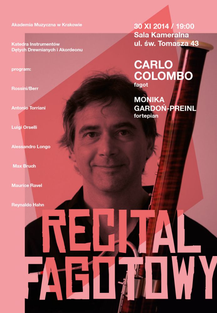 Katedra Instrumentów Dętych Drewnianych i Akordeonu Akademii Muzycznej w Krakowie serdecznie zaprasza w niedzielę 30 listopada o godzinie 19:00 do sali kameralnej Akademii Muzycznej w Krakowie na mistrzowski recital fagotowy. Wystšpi œwiatowej sławy fagocista Carlo Colombo. Na fortepianie towarzyszyć mu będzie Monika Gardoń-Preinl. Wstęp na koncert wolny.