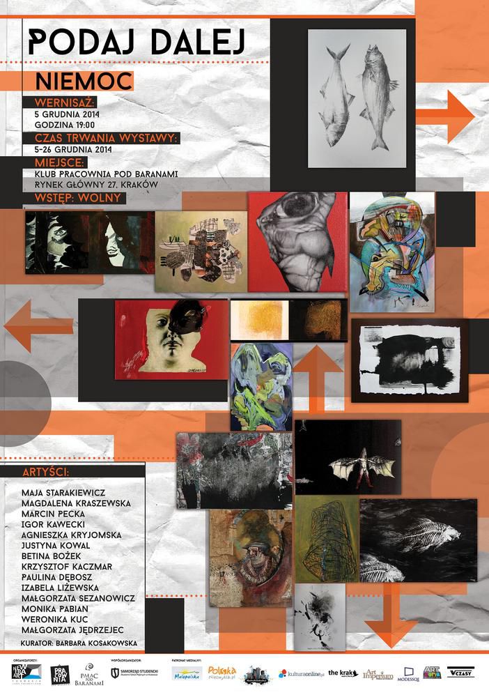 Wystawa Podaj dalej to 14 prac, 14 młodych artystów, którzy podjęli się gry w głuchy telefon, z tš różnicš, że obrazowo-wizualny. Nie było słów. Zamiast tego kolejni twórcy otrzymywali pracę swojego poprzednika. Nie znali się, nie spotykali, nie dyskutowali ze sobš. Akt tworzenia, dla którego inspiracjš była wizja zupełnie innego autora wskazał jednak na pewnš afiliację wsród tej grupy. Między kolejnymi pracami to zacierało się, to ponownie powracało wyjciowe hasło niemoc. Miejscami jest ono wyrane, odczuwalne, chociaż było znane tylko pierwszemu uczestnikowi projektu. Niezależnie od siebie powtarzajš się także inne motywy. Inspiracjš, w przypadku tych prac, jest również forma, kolor, historia zawarta w obrazie, lub chęć dopełnienia pierworysu.