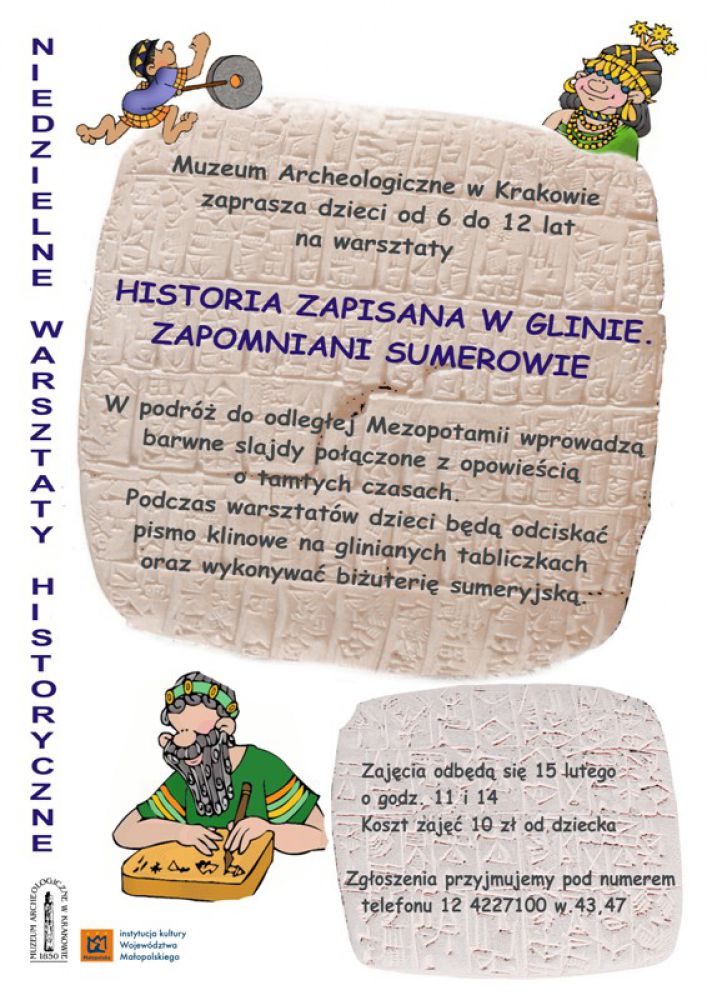 Podczas warsztatów dzieci będš odciskać pismo klinowe na glinianych tabliczkach oraz wykonywać biżuterię sumeryjskš z modeliny, makaronu i ozdobnego kartonu.