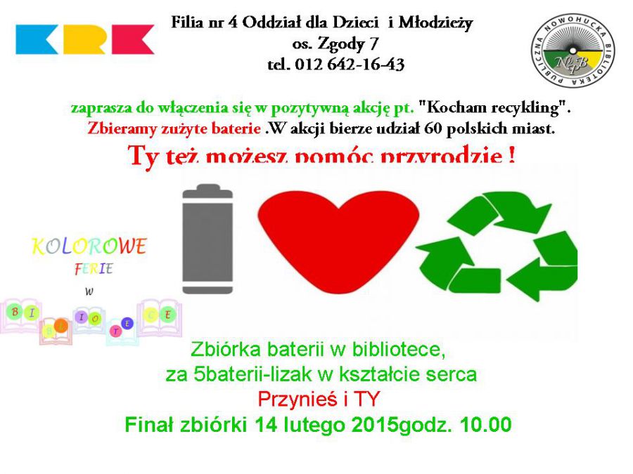 W Oddziale dla Dzieci i Młodzieży odbędzie się finał akcji – „Kocham recykling 2015”- zbieramy baterie i bateryjki-!. Idea akcji jest prosta, przynieœ baterie do biblioteki i pomóż przyrodzie oraz sobie. Biblioteka zaprasza do włšczenia się w akcję wszystkich mieszkańców Nowej Huty i nie tylko… BšdŸ eko ! Za każde 5-baterii lizak w kształcie serca przez cały miesišc!