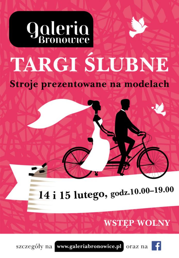 Odbywajšce się 14-15 lutego bezpłatne Targi lubne w Galerii Bronowice to znakomita okazja do zapoznania się z najnowszymi trendami panujšcymi w branży weselno-lubnej oraz poznania produktów i usług zwišzanych zarówno z organizacjš ceremonii zalubin, jak i przyjęcia weselnego. Na specjalnie przygotowanych stoiskach przyszli nowożeńcy znajdš ofertę m.in.: sukien i dodatków lubnych, garniturów, hoteli, restauracji oraz sal weselnych, cukierni, fotografów i kamerzystów, zespołów muzycznych, samochodów lubnych, kwiaciarni, jubilerów i wielu innych.