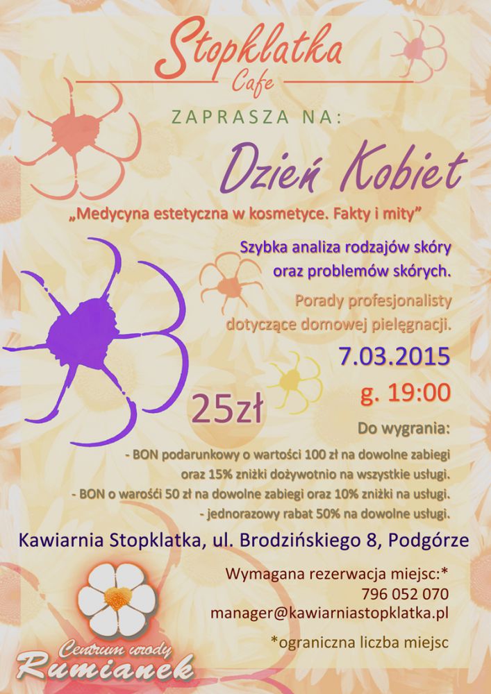 Kawiarnia Stopklatka oraz Centrum urody "Rumianek" zapraszajš przeddzień więta Kobiet wszystkie Panie na wyjštkowe warsztaty pt. "Medycyna estetyczna w kosmetyce. Fakty i mity"