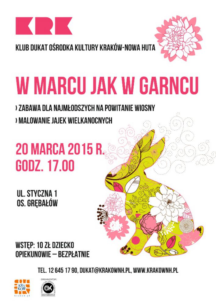 20 marca o godz. 17.00 zapraszamy najmłodszych na szalonš zabawę wiosennš w Klubie Dukat Oœrodka Kultury Kraków-Nowa Huta (ul. Styczna 1). W programie spotkania znajdš się zabawy, konkursy, wspólne tańce. We wspaniałych humorach i miłej atmosferze pożegnamy zimę i przywitamy wiosnę. Ponieważ zbliżajš się Œwięta Wielkanocne, wspólnie przygotujemy także kolorowe pisanki. Zabawa prowadzona będzie przez animatora, a towarzyszyć jej będzie - jak zawsze - słodki poczęstunek.