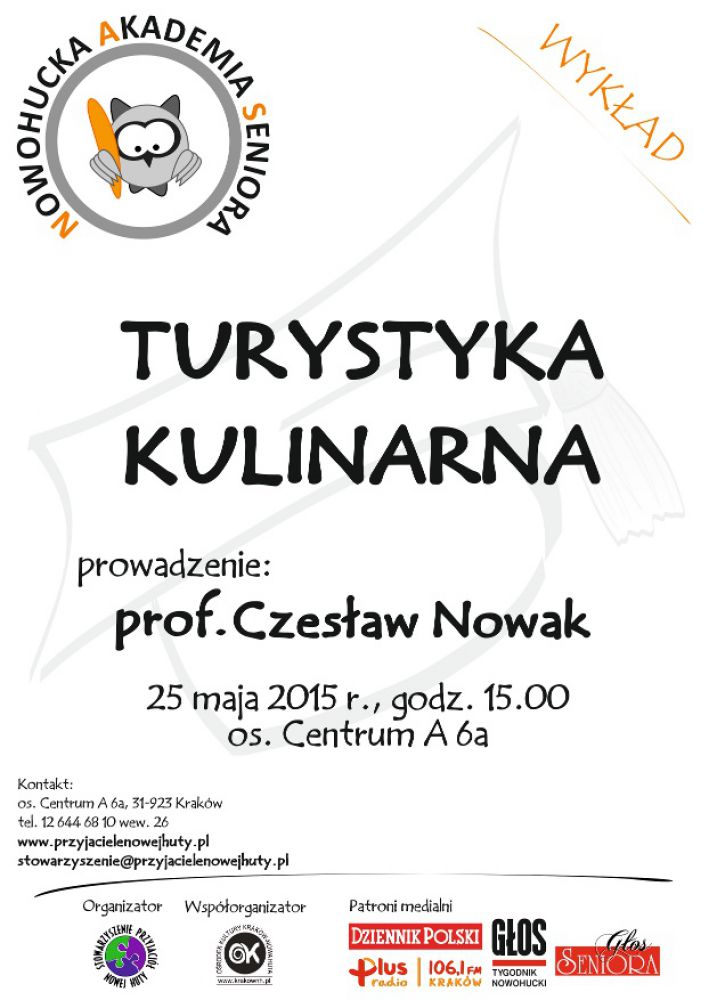 Zapraszamy na ostatni w tym roku akademickim wykład w Nowohuckiej Akademii Seniora (os. Centrum A 6a), który odbędzie się 25 maja o godz. 15.00. O tym jak zmienia się kuchnia w Polsce i na wiecie, o kulturze kulinarnej i o tym jak istotna jest ochrona kulinarnej tożsamoci narodowej opowie słuchaczom Nowohuckiej Akademii Seniora prof. Czesław Nowak z Uniwersytetu Rolniczego w Krakowie. Profesor współpracował z Departamentem Rolnictwa USA w Armenii, Kosowie, Serbii, Estonii i Rumunii. Zapraszajš: Stowarzyszenie Przyjaciół Nowej Huty oraz Orodek Kultury Kraków-Nowa Huta.