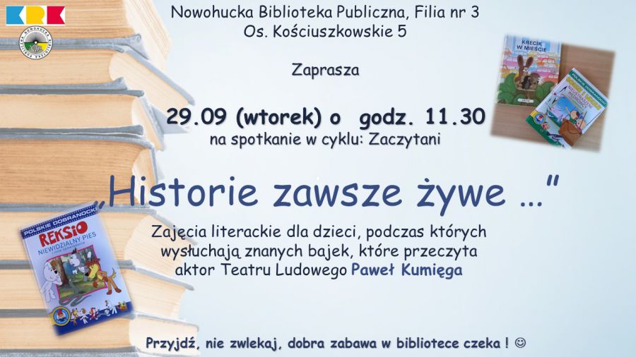 Biblioteka zaprasza dzieci na wysuchanie starych i lubianych bajek o przygodach wci modych bohaterw: Bolka i Lolka,Reksia, Misia Uszatka i Krecika w interpretacji aktora Teatru Ludowego Pawa Kumigi.