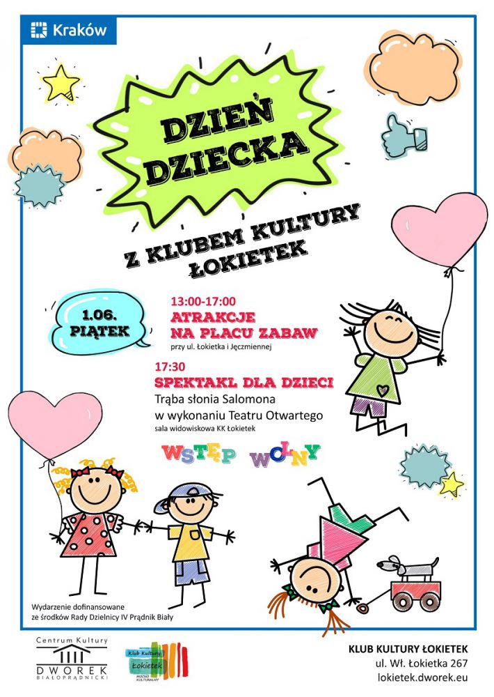 Po raz pierwszy zapraszamy na Dzień Dziecka organizowany przez Klub Kultury Łokietek - filię Centrum Kultury Dworek Białopršdnicki! Czekaja na Was atrakcje na pobliskim placu zabaw (animacje, stanowisko plastyczne i trochę ruchu), a na finał spektakl Tršba słonia Salomona w wykonaniu Teatru Otwartego.