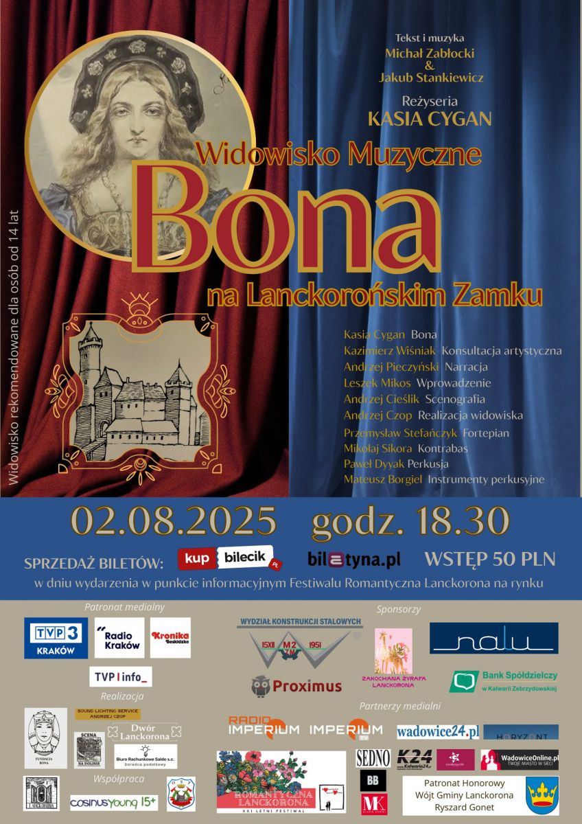 507 lat po swojej koronacji Bona nareszcie odwiedzi zamek w Lanckoronie! To nie żart. Już 2 sierpnia jako główne wydarzenie XXI Festiwalu Romantyczna Lanckorona odbędzie się spektakularne widowisko muzyczne „Bona na lanckorońskim zamku" - opowieść o miłości, władzy oraz trudnych wyborach.
