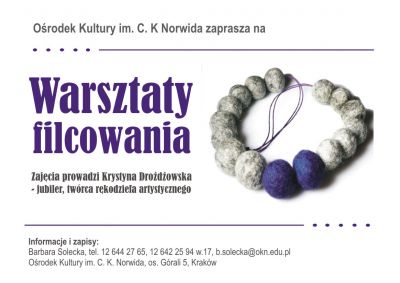 Zapraszamy osoby poczštkujšce, ale także takie, które majš podstawy już za sobš. Na naszych zajęciach filcujemy małe proste formy, kwiaty i etui na telefony a także awangardowš biżuterię z czesanki wełnianej - naszyjniki z kulek filcowanych na mokro oraz naszyjniki z dredów. To przyjemne zajęcie pozostawia duże pole dla wyobrani, zapewniajšc jednoczenie wysoki poziom satysfakcji, także osobom bez plastycznego przygotowania. Różnorodnoć technik oraz stosowanych materiałów pobudzi Twojš wyobranię, zaskoczy Cię Twoja kreatywnoć.