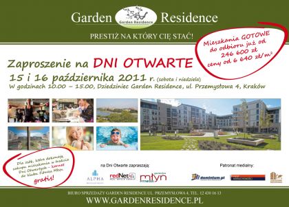 Już 15 i 16 października (najbliższa sobota i niedziela) Garden Residence zaprasza na kolejną edycję Dni Otwartych. Odwiedzający będą mogli nie tylko dokładnie oglądnąć gotowe mieszkania, ale także mogą liczyć na specjalnie przygotowaną na tę okazję ofertą rabatową. Nie zabraknie też dodatkowych bonusów – osoby, które zdecydują się kupić mieszkanie podczas Dni Otwartych otrzymają w prezencie karnet do ekskluzywnego klubu Fitness Młyn, znajdującego się na terenie inwestycji!
