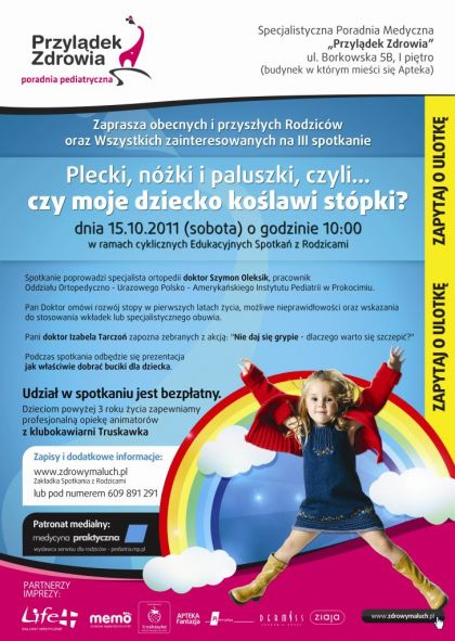 Gościem specjalnym spotkania "Plecki, nóżki i paluszki – czyli czy moje dziecko koślawi stópki?”, będzie Szymon Oleksik lekarz ortopeda z Oddziału Ortopedyczno-Urazowego Polsko-Amerykańskiego Instytutu Pediatrii w Prokocimiu. Ekspert podzieli się swoim oświadczeniem - zwróci uwagę na prawidłowy rozwój stóp u dzieci, omówi zaburzenia chodu i wskazania do leczenia lub stosowania wkładek czy specjalistycznego obuwia. Ponadto odbędzie się prezentacja „Jak właściwie dobrać buciki dla dziecka?”. Na zakończenie Izabela Tarczoń, lekarz pediatra ze Specjalistycznej Poradni Medycznej „Przylądek Zdrowia” wyjaśni, jak uchronić siebie i dzieci przed grypą.