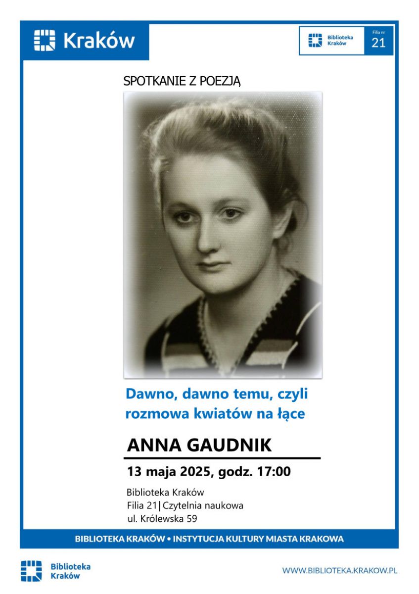 Spotkanie z Anną Gaudnik. Ze swojej poezji znana jest od 20 lat. Z początkiem XXI wieku podjęła inicjatywę publicznego zaprezentowania swojej twórczości. Od tego momentu, w okolicznych instytucjach kultury nieustannie organizuje wieczorki poetyckie, bierze udział w lekcjach poświęconych poezji, zasiada w szkolnych konkursach recytatorskich i teatralnych.