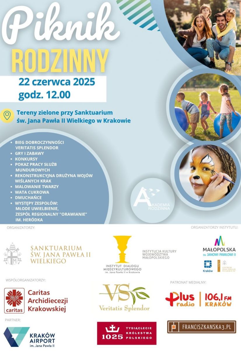 Sanktuarium św. Jana Pawła II Wielkiego w Krakowie oraz Instytut Dialogu Międzykulturowego im. Jana Pawła II w Krakowie zapraszają na wielkie rodzinne święto - Piknik Rodzinny, który odbędzie się 22 czerwca od godz. 12:00 na terenach zielonych przy Sanktuarium św. Jana Pawła II Wielkiego w Krakowie.